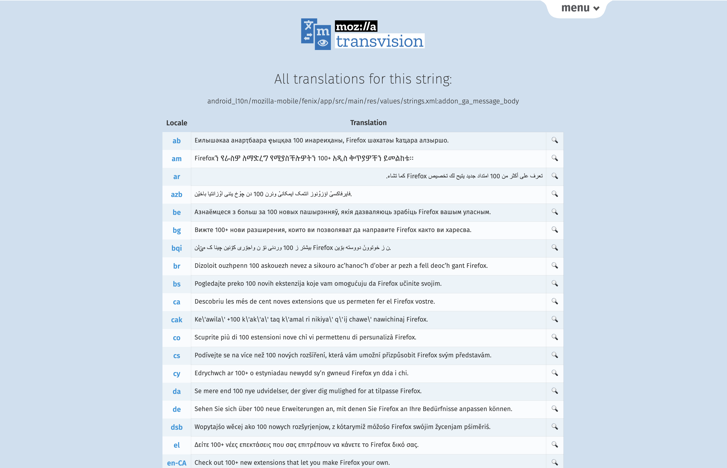 If you want to get a better picture of a source string with different translations, go to the Entity Translations page. By clicking the “All Locales” button in Translation Search for a string, you can see the source string translated into every available locale. This is useful for comparing similar locale translations and getting a broader picture of a string’s context. This feature is intended to replace Transvision’s translation list for a particular entity.