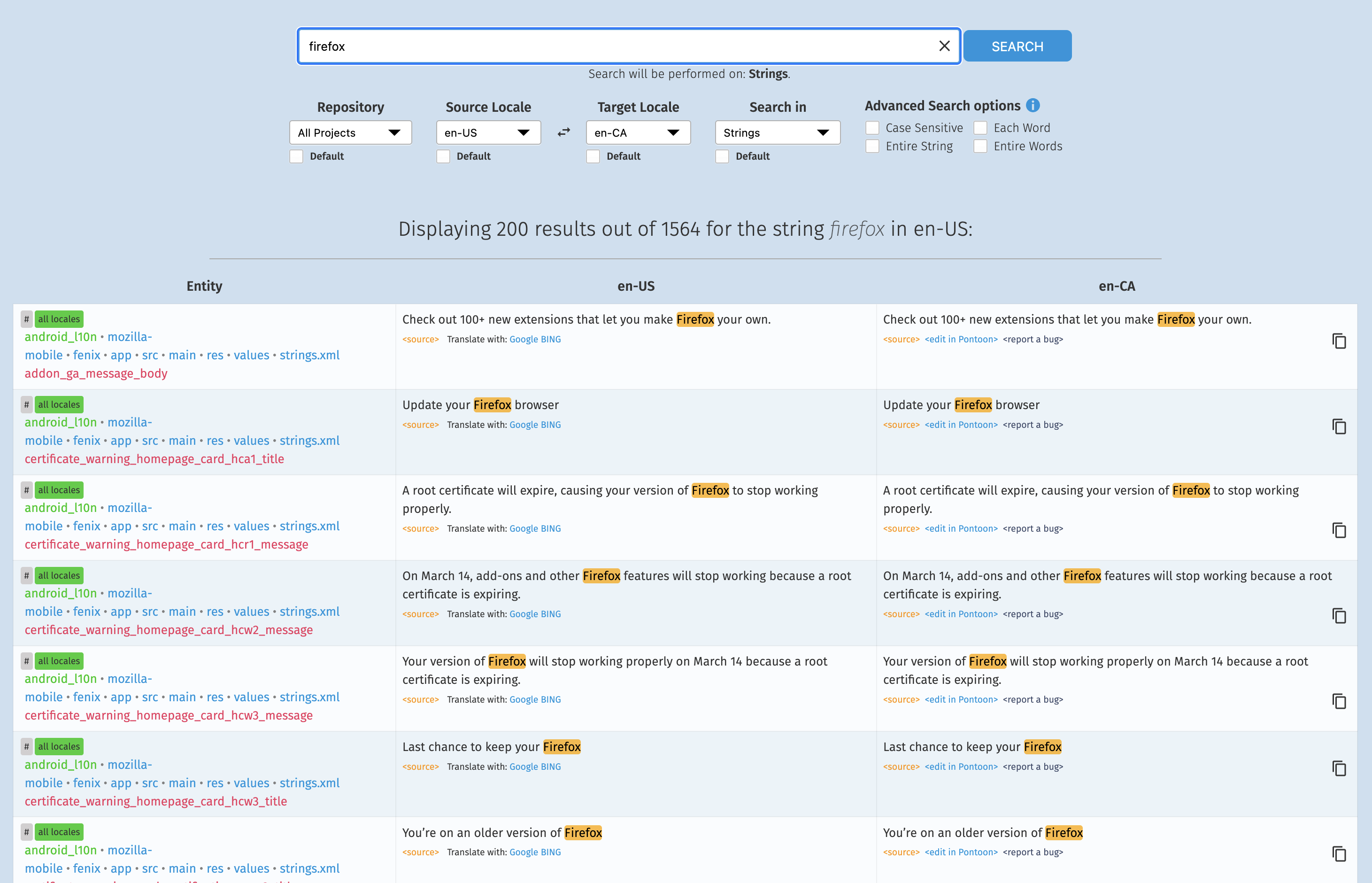 Recently, we have been working to unify localization tools and give localizers and developers smoother, more streamlined workflows. This is why we are excited to introduce Pontoon’s new Translation Search feature, where everyone can search for strings across all projects and locales at Mozilla.